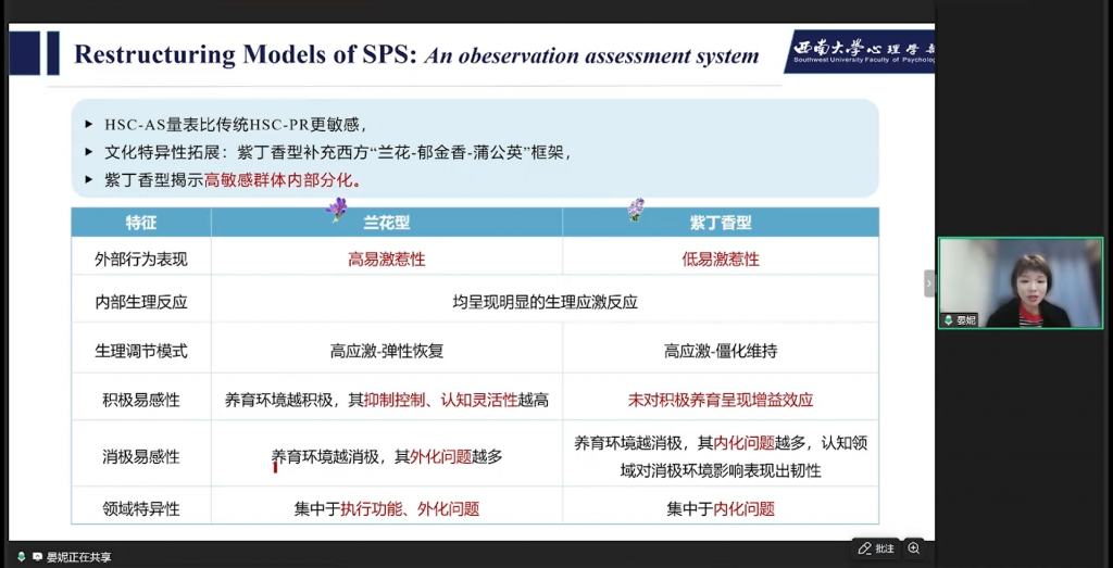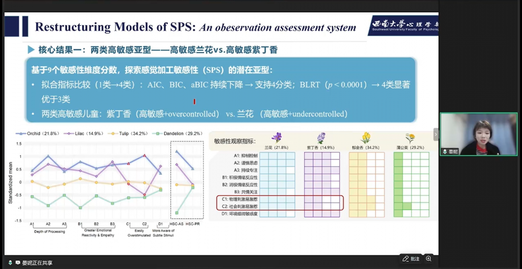 基于新工具研究,得出核心结果:两类高敏感亚型——高敏感兰花vs高敏感紫丁香,表现出对物理刺激和社会刺激的易激惹性不一样;敏感亚型的生理差异,紫丁香型生理反应调节性最差,表现出比较“僵化”的生理调节模式;敏感亚型存在不同的“环境易感性”,在内外化问题、抑制控制、认知灵活性等路径存在显著的组间差异。